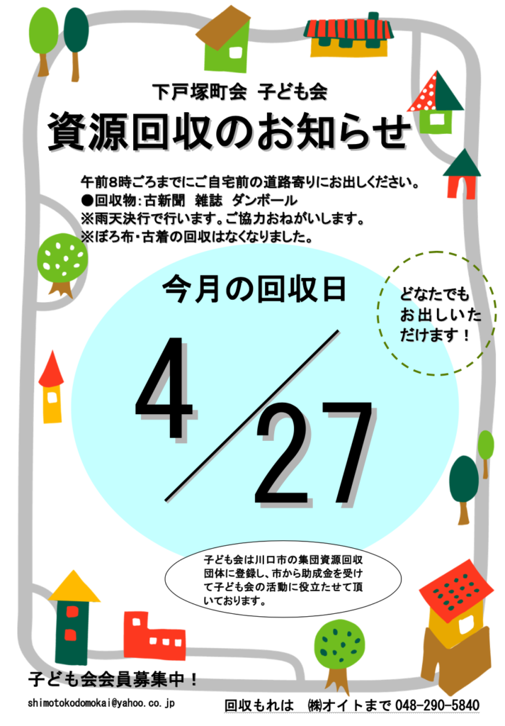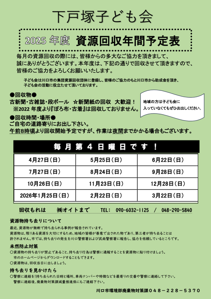 今年度も同様に毎月第四日曜日の資源回収となります。ご協力よろしくお願いいたします。